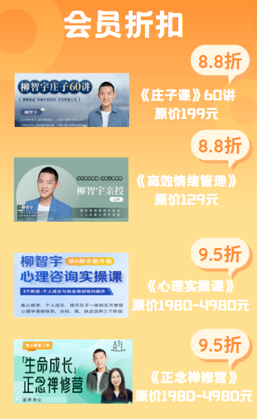 加入365生命成长会员,您可以获得高效情绪管理课、庄子课、禅修营、实操课等全方面优惠,量身打造自己的成长路线。